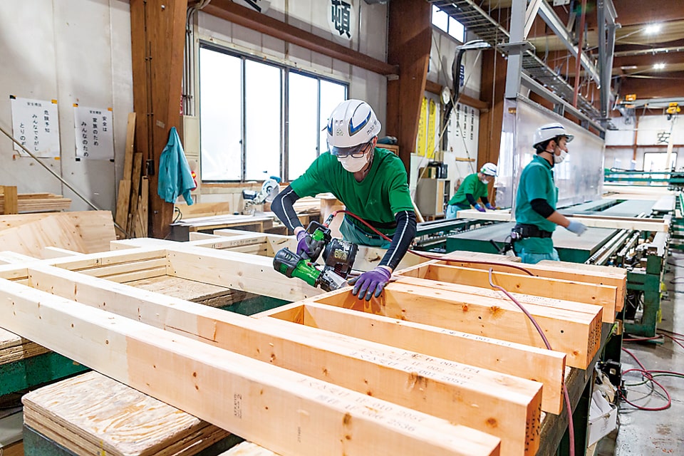 高い強度と精度を実現する集成材を加工し、横架材、柱材、合板を製造。在来工法用の溝切り加工や金具工法の金物取付までを行います。